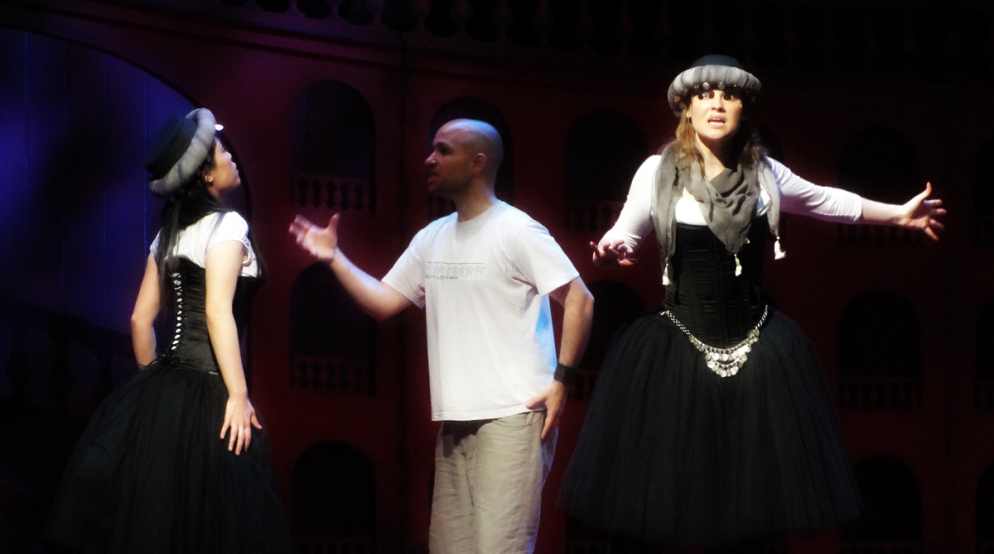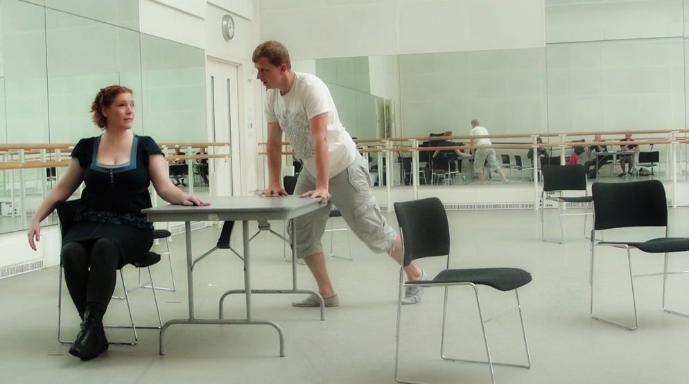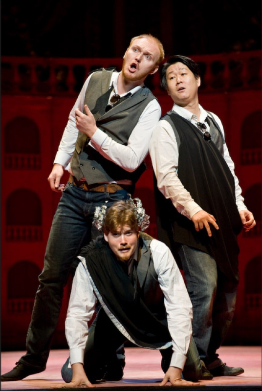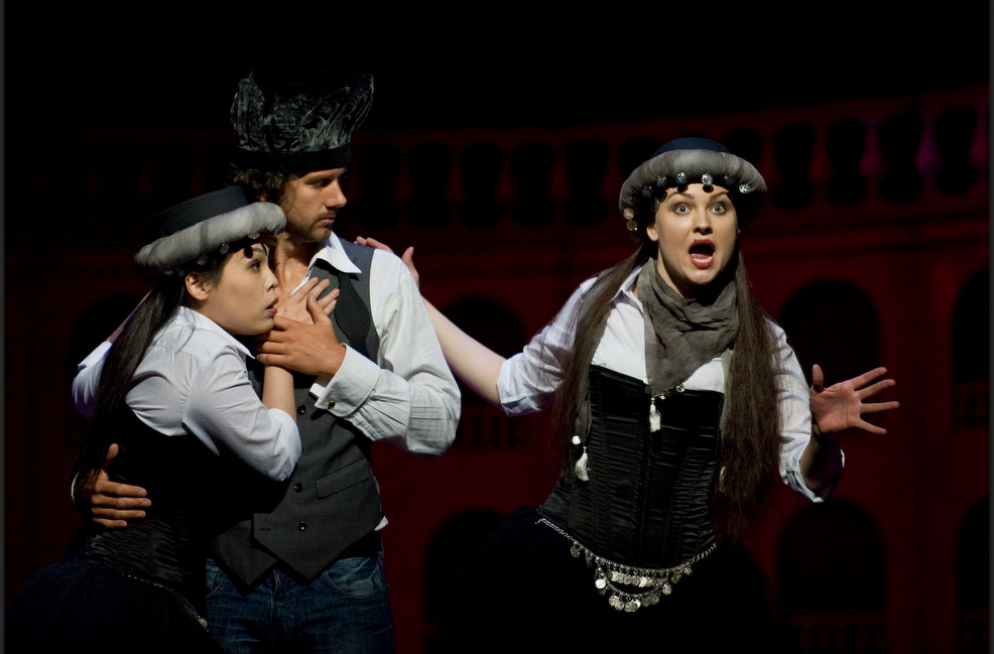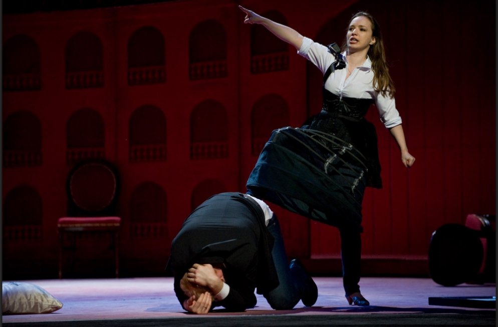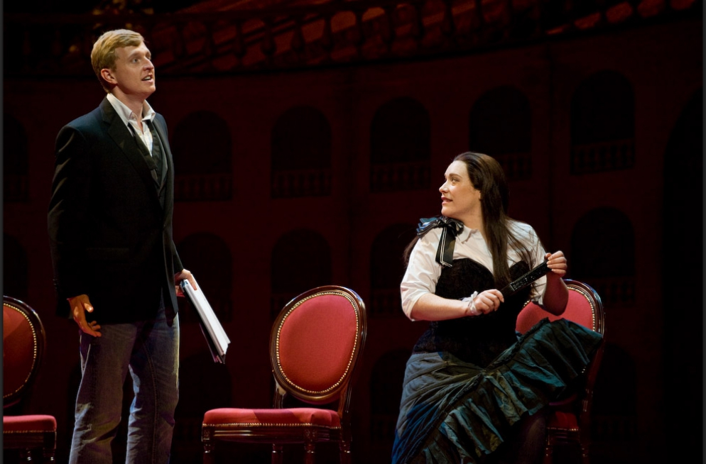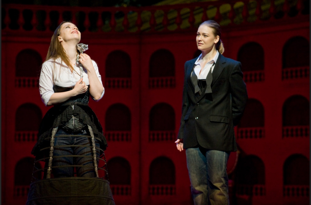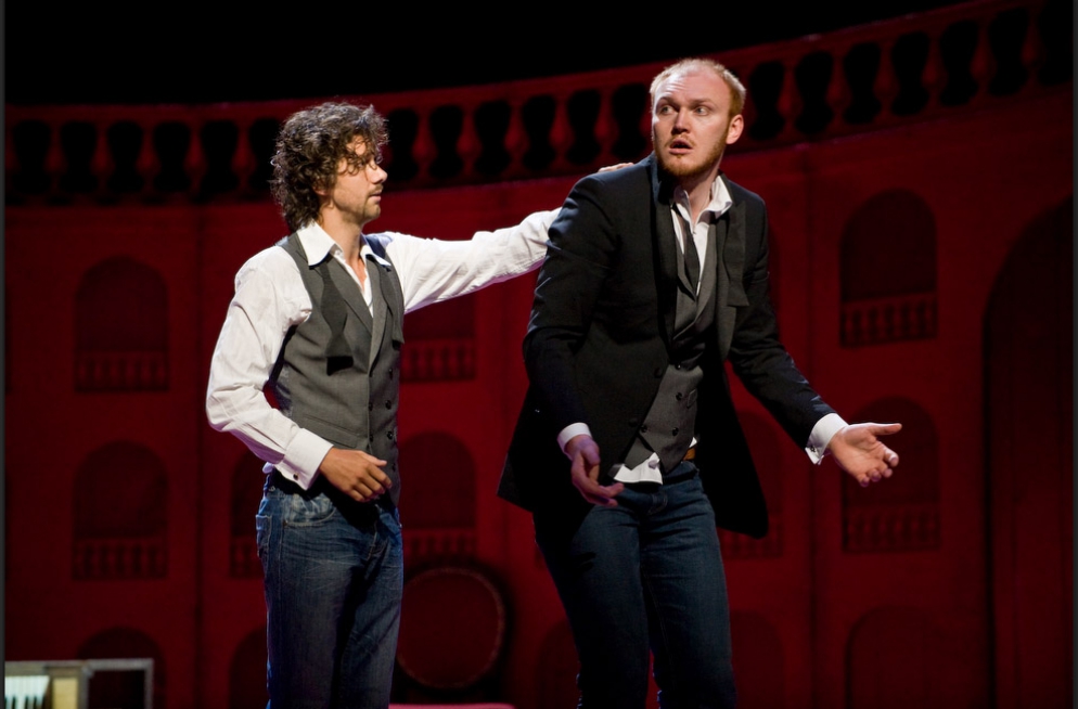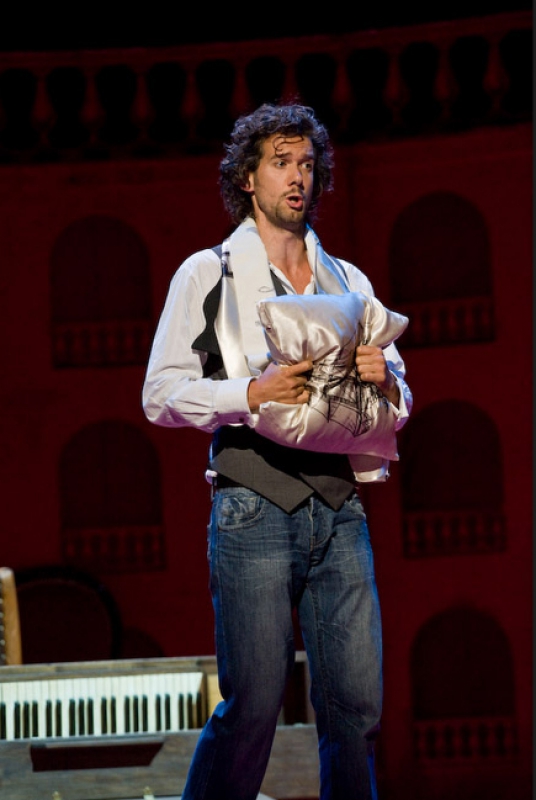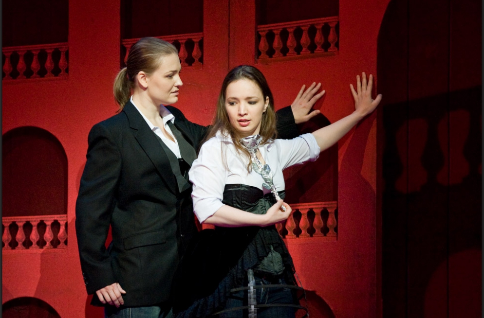 A single scenographic frame, a uniform costume design with small variations for the different characters, generating the versatility needed to represent the different scenes that conform the show: extracts from operas by Richard Strauss in the first part (beginning of Second Act of Der Rosenkavalier, Capriccio's trio (Des Dichters Worte) and the end of second act of Intermezzo and Die Schweigsame Frau) and operetta extracts in the second part (patriotic trio from La Belle Hélène, trio from Der Zigeunerbaron, aria from Giuditta (Freunde, das Leben ist lebenswert), an extract from Act I Naughty Marietta and the end of the Second Act of Die Fledermaus).