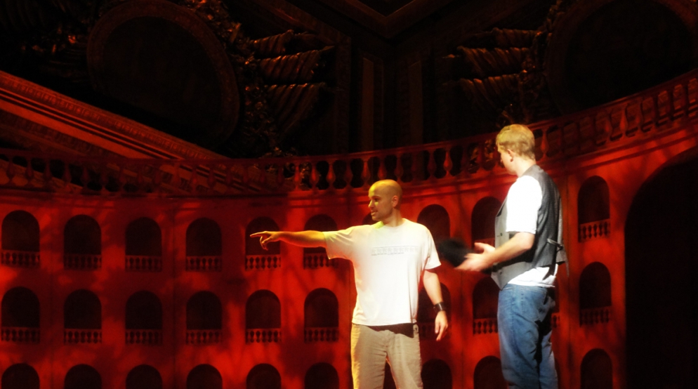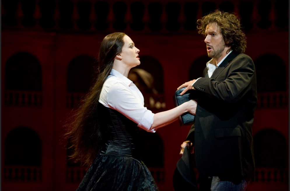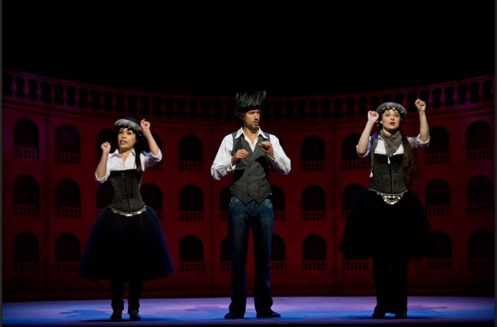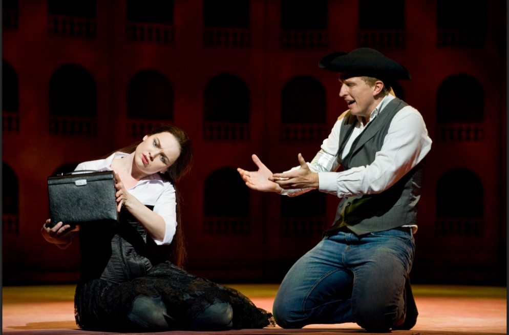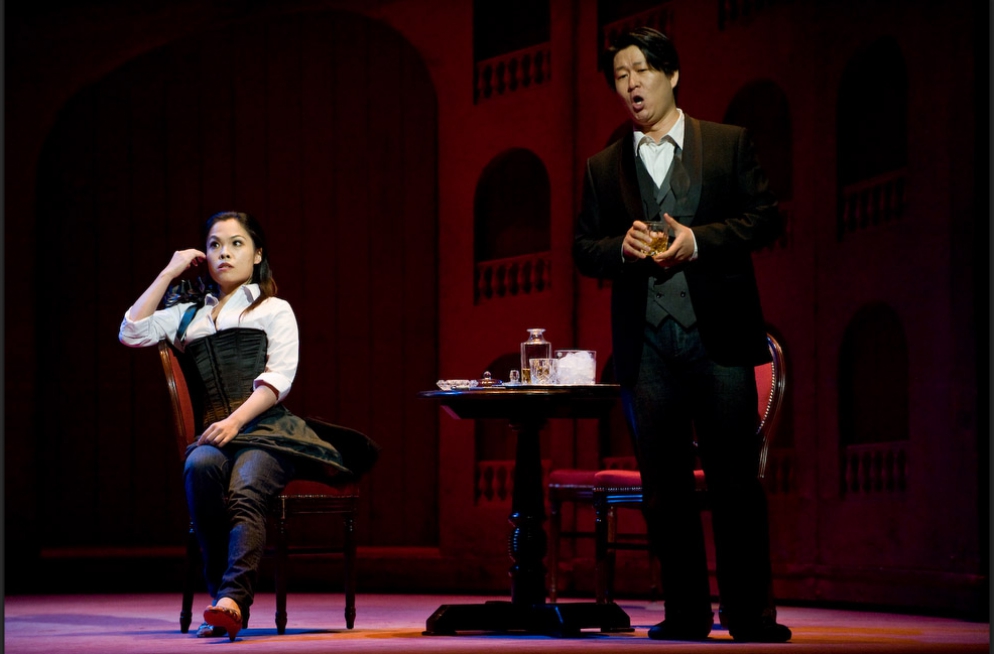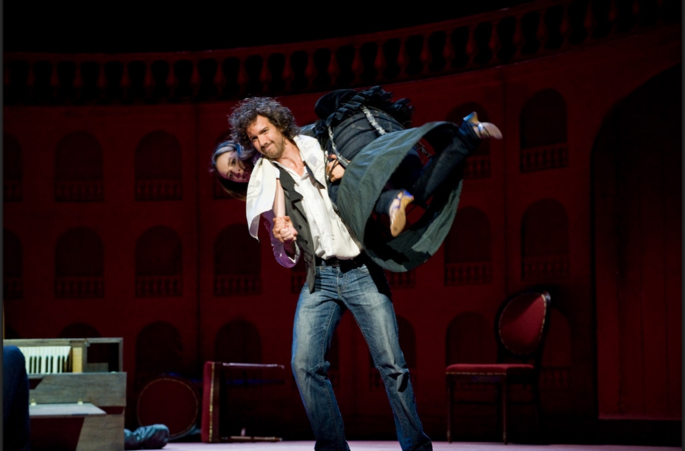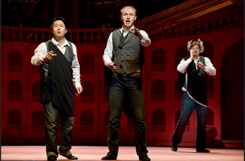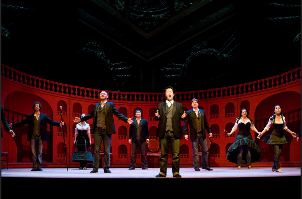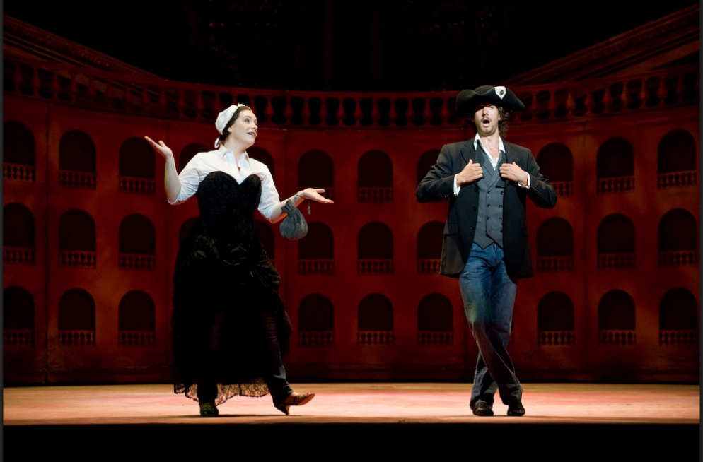 A single scenographic frame, a uniform costume design with small variations for the different characters, generating the versatility needed to represent the different scenes that conform the show: extracts from operas by Richard Strauss in the first part (beginning of Second Act of Der Rosenkavalier, Capriccio's trio (Des Dichters Worte) and the end of second act of Intermezzo and Die Schweigsame Frau) and operetta extracts in the second part (patriotic trio from La Belle Hélène, trio from Der Zigeunerbaron, aria from Giuditta (Freunde, das Leben ist lebenswert), an extract from Act I Naughty Marietta and the end of the Second Act of Die Fledermaus).