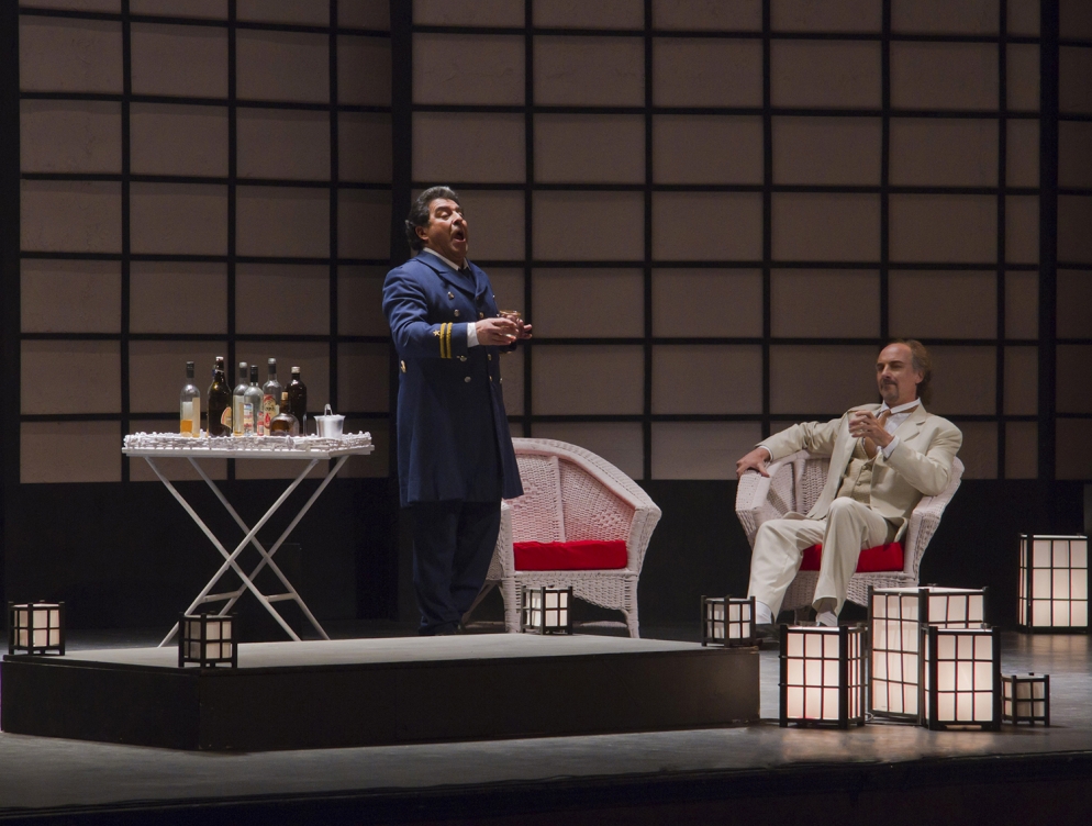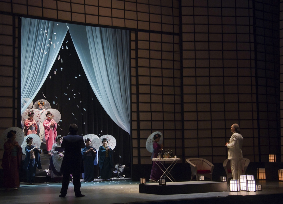 En una casa en una colina cerca de Nagasaki, Pinkerton, oficial de la marina americana, se casa con Cio Cio San, una geisha conocida también como Madama Butterfly. Aunque para PInkerton es un matrimonio falso y no representa más que entretenimiento hasta casarse con una verdadera esposa americana en una veradera boda, para Butterfly es mucho más. Ella renuncia a su religión para convertirse a la de Pinkerton. Luego del casamiento, donde asisten casi todos sus parientes, llega enfurecido el Tío Bonzo, enterado de que Butterfly ha renegado de ellos, la repudia e insta a la familia a renegar de ella. Todos se van y Butterfly, desolada, sólo encuentra consuelo en el amor que siente por Pinkerton. Pero tres días después del casamiento, el marino debe volver a Amércia, prometiendo volver al año siguiente. Pasan tres años sin que Butterfly tenga noticias. Sumida prácticamente en la miseria espera, sin embargo, fielmente. Goro, el casamentero, le trae siempre candidatos nuevos, pero ella se considera casada. Sharpless, el cónsul americano, llega finalmente con noticias de Pinkerton. Trata de prevenirla, llega a preguntarle qué haría si Pinkerton no volviera a ella, generando una gran reacción en Butterfly que termina pidiéndole se retire; pero antes le presenta a Dolor, el hijo de la japonesa con Pinkerton. Sharlpess conmocionado promete hacer algo al respecto. El cañón del puerto anuncia la llegada de un nuevo barco. Es el barco de Pinkerton, que vuelve. Espera toda la noche que él venga a su casa, pero a l amañana comienza a comprender que su ansiedad por verlo puede no ser correspondida. En el momento en que decide irse finalmente a descasar, llegan Pinkerton con Sharlpess y Kate, la verdadera esposa americana del marino. Sharlpess les ha contado sobre el niño, y vienen a buscarlo para criarlo en América. Pero Pinkerton no puede enfrentarla, y se marcha avergonzado. La mujer de Pinkerton pide a Suzuky que hable con Butterfly y le aconseje entregar al niño. Finalmente Butterfly decide hacerlo, pero pide que sea él mismo quien venga a buscar a su hijo. Deshornrada, toma la daga con que su padre se había suicidado y mientras se escucha llegar a Pinkerton desesperado, intuyendo la resolución, toma su propia vida.