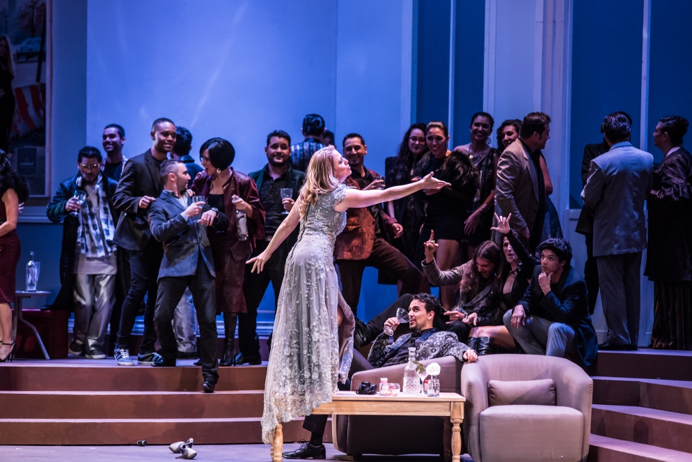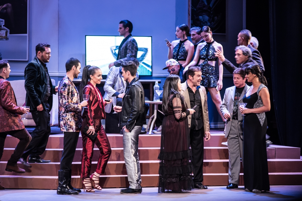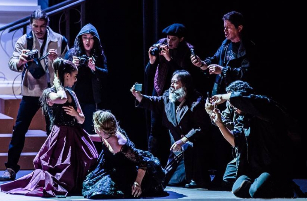 Con un espejo puesto de cara a la sociedad contemporánea, esta nueva producción de la ópera de Verdi pone su acento en el dolor y el sufrimiento escondidos tras del glamour de las cámaras; profundiza en la maquinaria mediática y las redes sociales –implacables y abrumadoras- que dan la bienvenida a gente dispuesta a exponer su vida al escrutinio público para el entretenimiento impiadoso y el consumo inagotable del público.